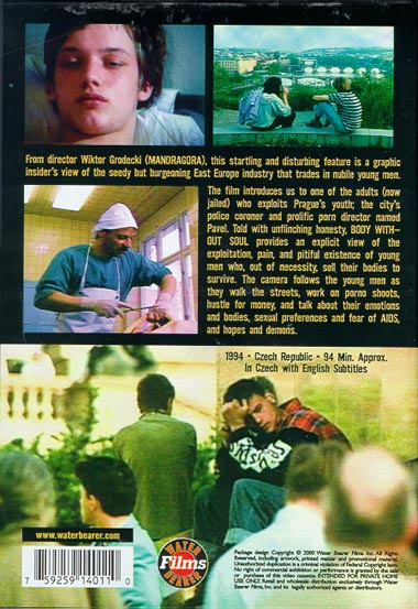Documentary look at doomed male prostitutes in Prague, ages 15 to 18, who troll at the public swimming pool, the train station, a video arcade, and a disco. After the boys talk about how they got in the game, the camera follows them to the home of Pavel Rousek. Under the name Hans Miller, he makes gay porno videos, primarily for German distribution. Intercut with a movie shoot chez Rousek is an interview that follows him to his day job at a morgue, where he performs an autopsy as he talks about his work. The sex is without protection; the boys are without family. They talk about their bodies and souls, money, their sexual orientation, AIDS, their dreams, and death.